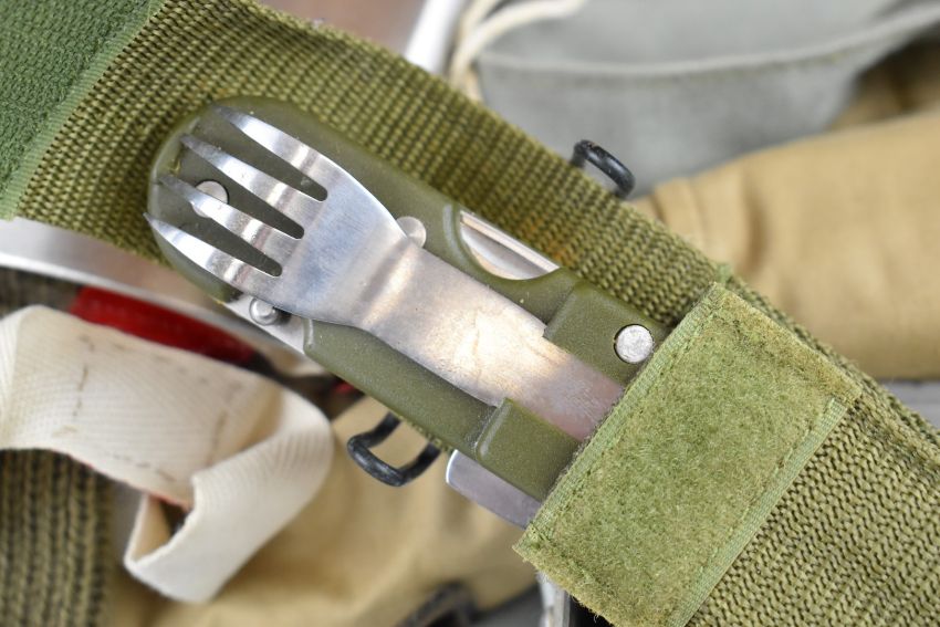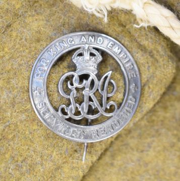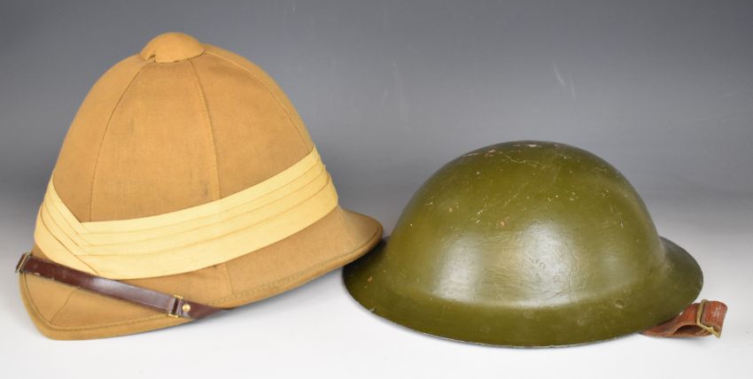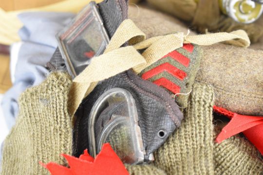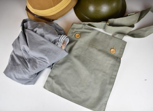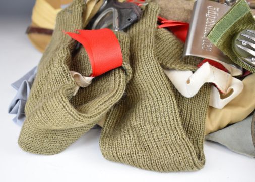 Re-enactment uniform and equipment including cutaway jacket with 4th South African badges, kilt (both large) by Locharron of Scotland, bonnet (7¾"), two shirts, steel helmet, Wolseley style helmet, mess tins and water bottle