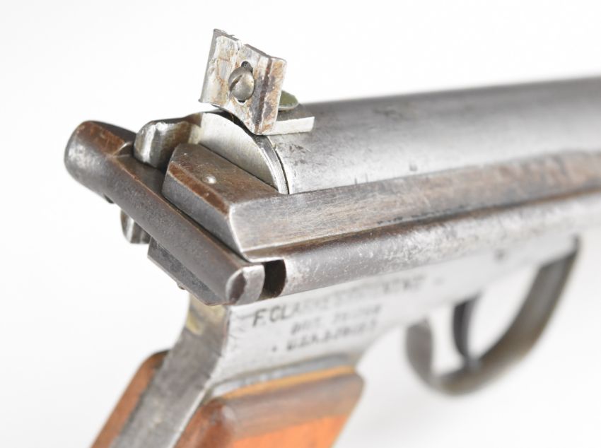Accles & Shelvoke Ltd F Clarke patent The Warrior .177 side lever air pistol with wooden grips and adjustable sights, serial number 5706.