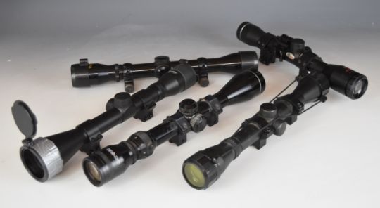 Five various rifle scopes comprising Richter Optik 4x40, SMK 4x32, Tasco 3-9x40, Optima 4x32 and one other 4x32.