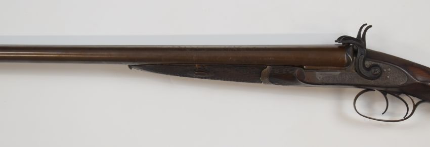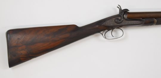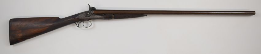 Burrow 12 bore side by side pinfire hammer action shotgun with named and engraved locks, engraved stylised dolphin hammers, trigger guard and top plate, chequered grip and forend, carved teardrop to the wrist, vacant cartouche to the underside of the stock, side lever and 30 inch Damascus barrels, overall length 117cm.