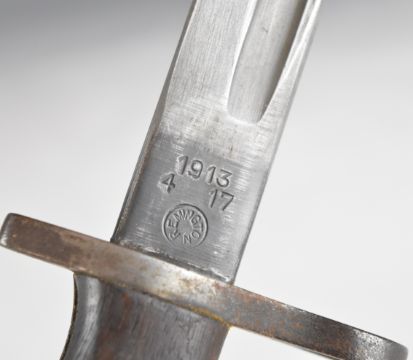 British 1913 pattern sword bayonet with wooden grips, good stamps to ricasso including 4/17 and Remington, 42cm fullered single edged blade, scabbard and later frog. PLEASE NOTE ALL BLADED ITEMS ARE SUBJECT TO OVER 18 CHECK ON COLLECTION OR DELIVERY