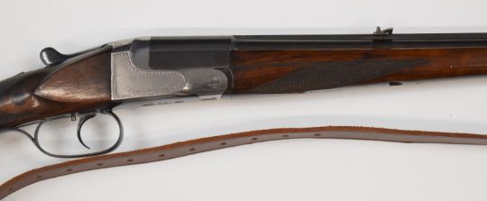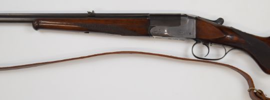 J P Sauer & Son .410 single barelled shotgun converted from a 8.15x46R sporting rifle, with named and border engraved lock, chequered semi-pistol grip and forend, raised cheek piece to the stock, leather sling, pop-up sights and 26.75 inch smooth bored barrel, overall length 109.5cm, length of pull 35.5cm, serial number 277885. PLEASE NOTE THAT A VALID RELEVANT FIREARMS/SHOTGUN CERTIFICATE IS REQUIRED TO HANDLE/PURCHASE THIS ITEM.