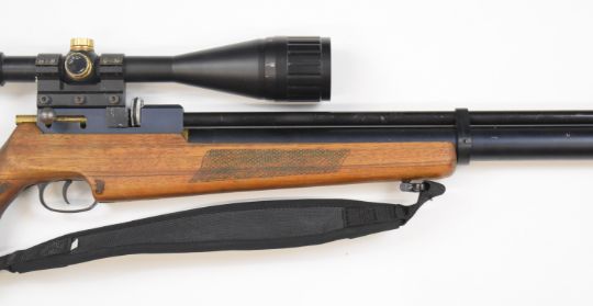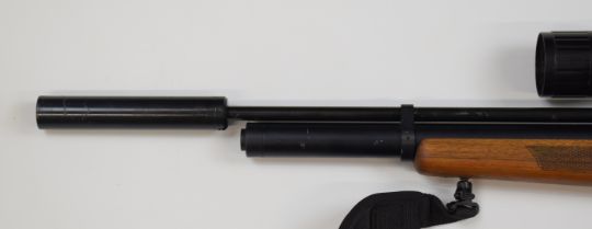 FX Logun Solo .22 PCP air rifle with chequered semi-pistol grip and forend, raised cheek piece, adjustable trigger, sling, 10-shot magazine and BSA Essencial scope, serial number fx 8201.