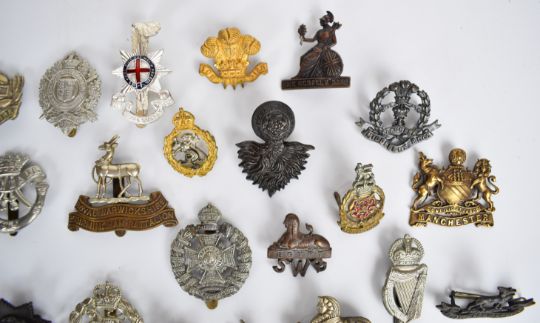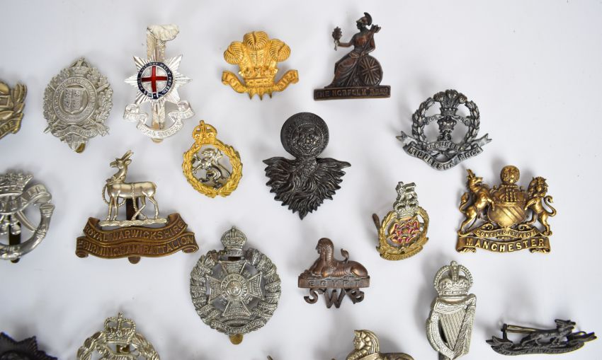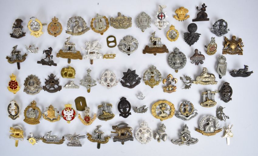 Collection of approximately 60 British Army badges including Royal Sussex Regiment, Gloucestershire Regiment, Norfolk Regiment, Royal Warwickshire Regiment, The Buffs, London Rifle Brigade, Notts & Derby Regiment, Royal Artillery and Middlesex Regiment, etc, some restrikes
