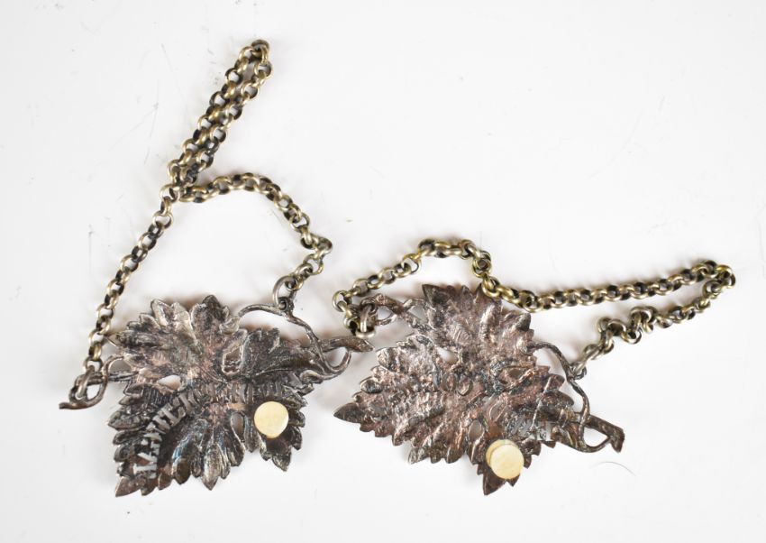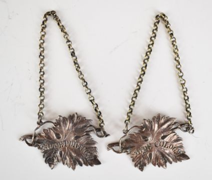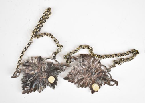 William IV pair of hallmarked silver pierced leaf shape bottle tickets for Eau De Cologne and Eau De Portugal (men's hair oil), London 1831, maker Charles Rawlings & William Summers