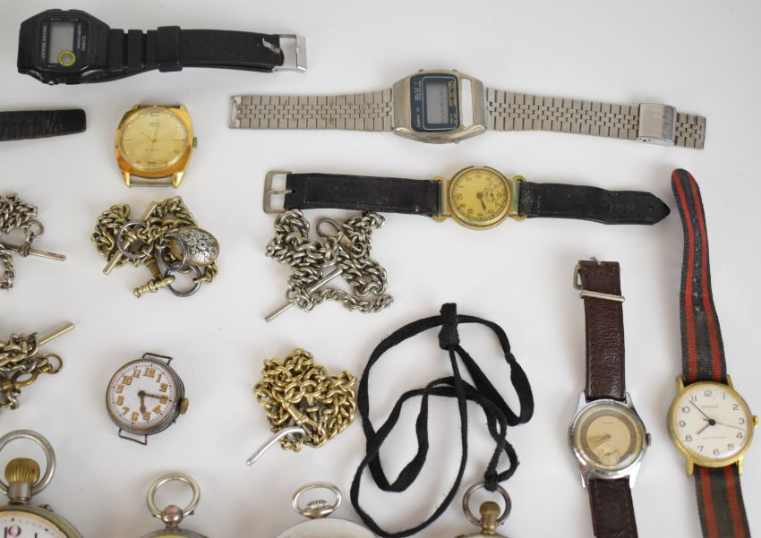 Nineteen various pocket and wristwatches including a 9ct gold Garrard example, Sekonda, Mistas, Ingersoll, J G Graves The Exress English Lever, keyless winding 'Goliath' pocket watch etc together with five pocket watch chains.