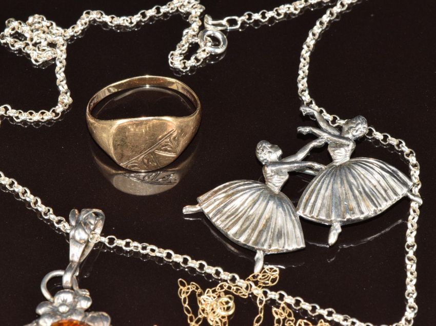 A 9ct gold chain and faux pearl pendant (0.3g), 9ct gold signet ring (2.7g, size R), hallmarked silver ballerina brooch and a silver pendant set with pressed amber