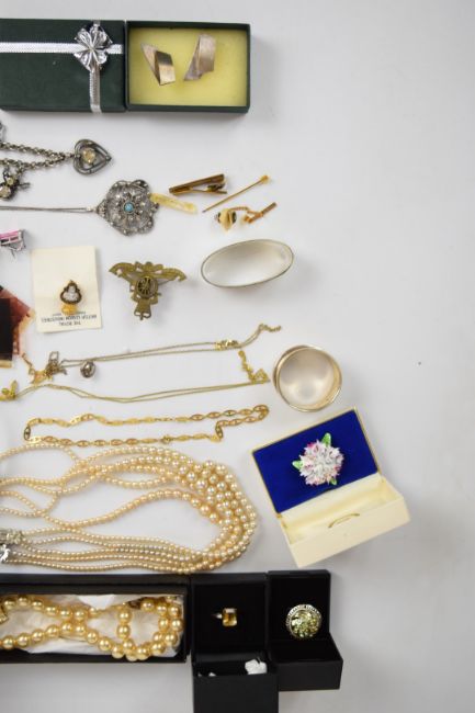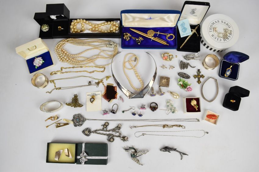 A collection of jewellery, some silver including two napkin rings, Celtic brooch, earrings, collar, necklace and Thomas Sabo charm bracelet, a ring set with a citrine, Wedgwood pendant, JewelCraft bracelet, marcasite brooches, etc