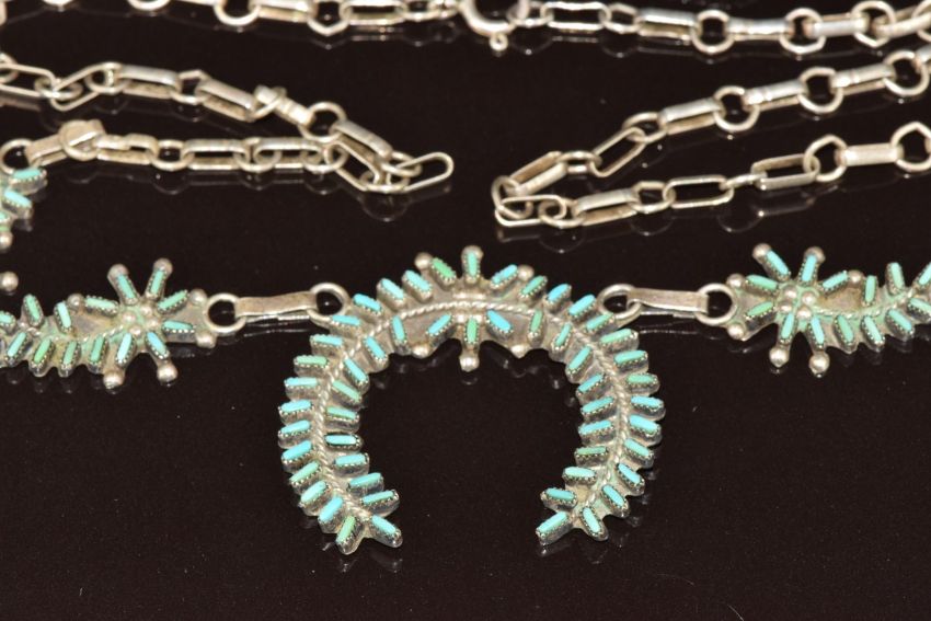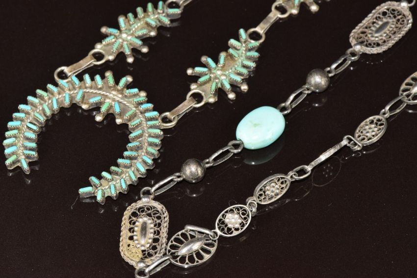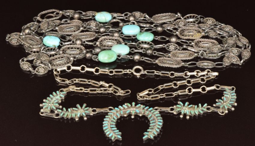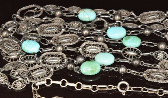 Navajo silver necklace set with turquoise and a silver necklace made up of filigree panels and turquoise beads, 70.1g, 162 & 50cm