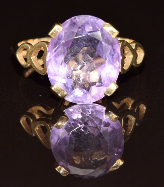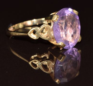 A 9ct gold ring set with an oval cut amethyst, 2.8g, size M