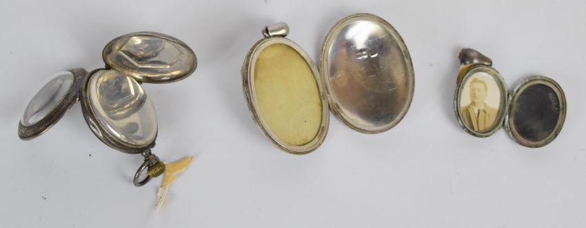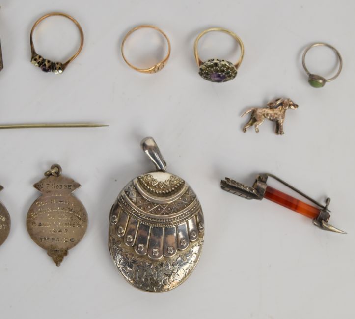 A collection of silver jewellery including Victorian locket hallmarked Birmingham 1882, fob watch, two fobs, brooch in the form of an arrow set with agate and three rings, together with a white metal locket, 9ct gold and silver ring, etc