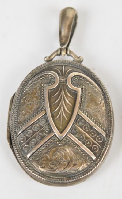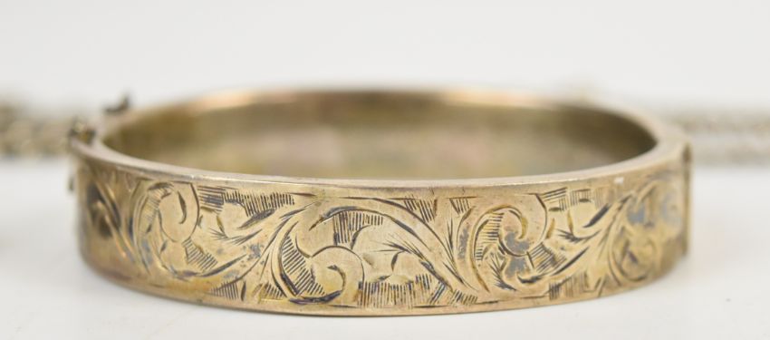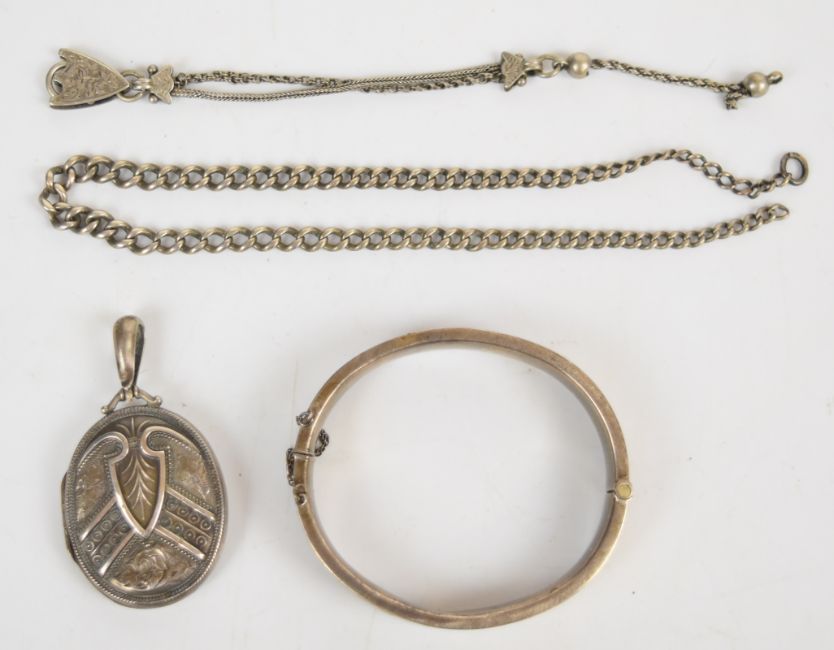 Victorian hallmarked silver locket, silver bangle, silver case and two silver fob chains, 78g