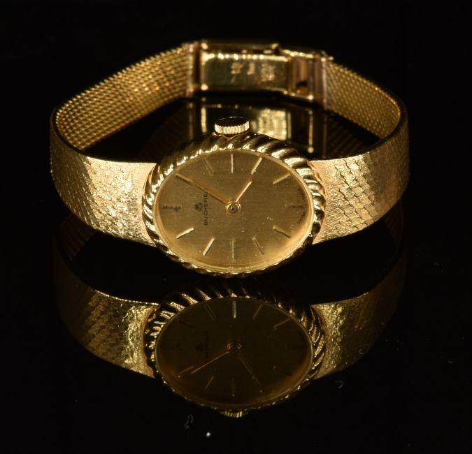 Bucherer 18ct gold ladies wristwatch with gold hands, baton hour markers and dial, rope twist case and signed 17 jewel movement, on integral 18ct gold bracelet, case diameter 20mm, serial number V259, 34g, in original box with guarantee and purchase receipt.