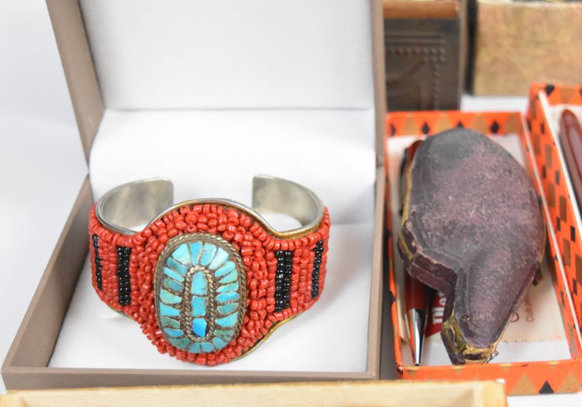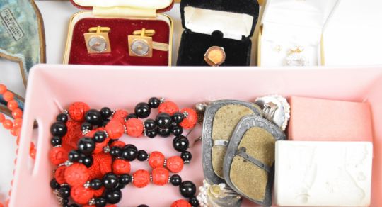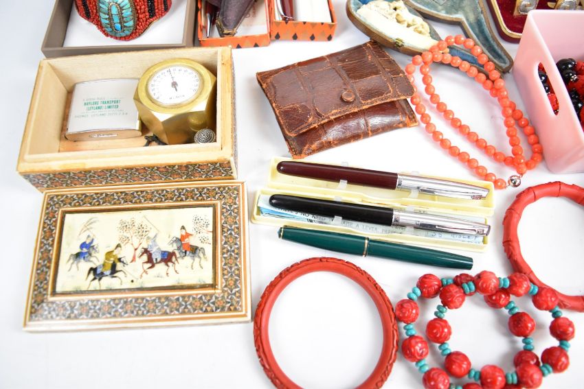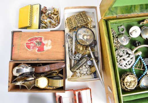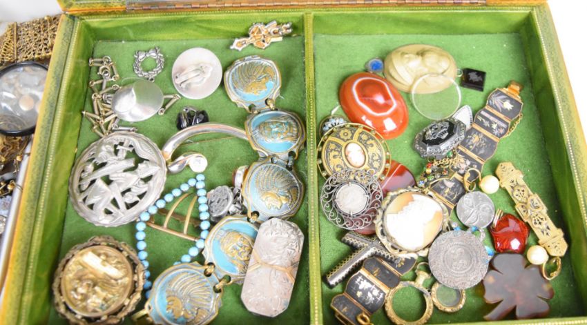 A collection of jewellery including c1900 silver brooch, Japanese bracelet, silver coin brooch, lava cameo, Norwegian silver brooch, silver earrings, beaded necklaces, Toledo brooch set with a cameo, vintage brooches, watches, etc
