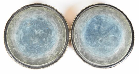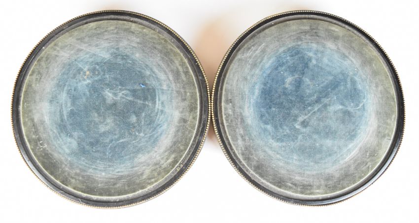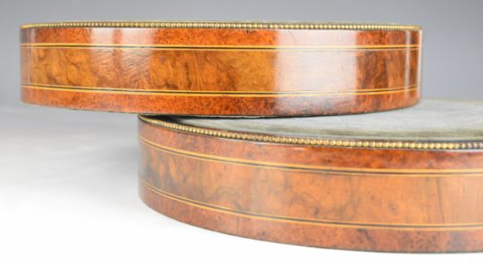Pair of 19th or early 20thC walnut and burr wood inlaid glass dome bases, with beaded gilt edging, diameter 30.5, height 6cm