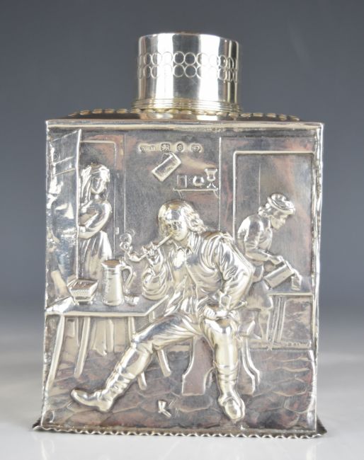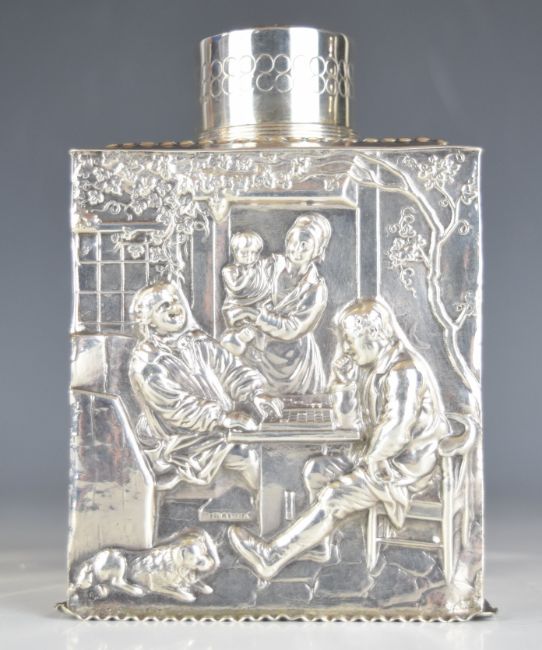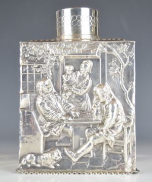 Victorian hallmarked silver tea caddy with embossed decoration of continental interior scenes with figures including two playing a board game, Birmingham 1892, maker Nathan & Hayes, 13.5cm, weight 271g