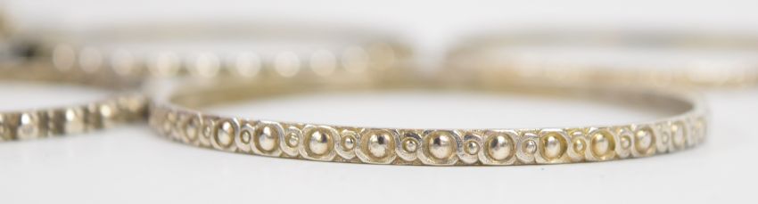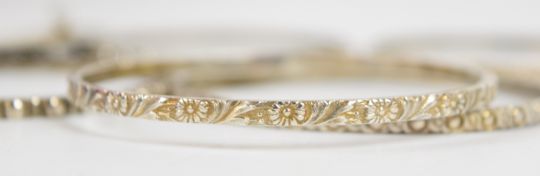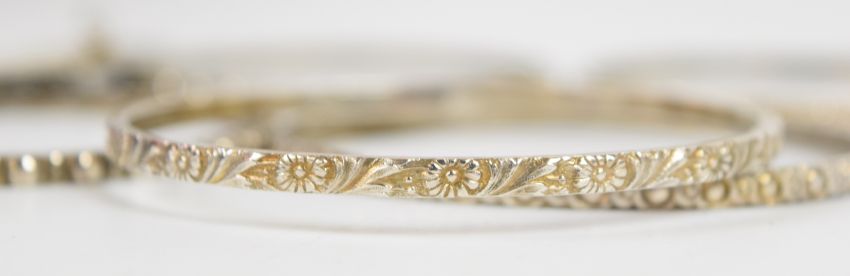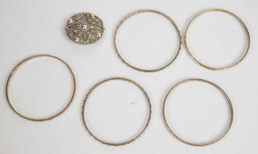 Five Libyan silver bangles with floral and circular decoration and a white metal brooch