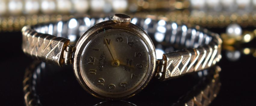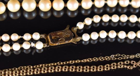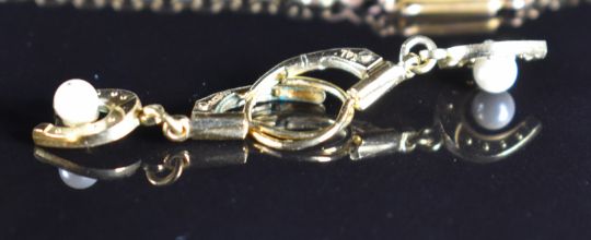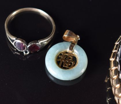 A 9ct gold cross and chain (0.8g), 9ct gold cased Rotary watch, Victorian ring set with foiled garnets, 9ct gold pendant set with jadeite, yellow metal chain (2.6g), a pair of gold plated horseshoe earrings and a double strand of faux pearls with 9ct gold clasp