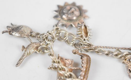 A silver charm bracelet with fifteen silver charms including teddy bear, plane, camera, donkey, etc, 49.1g