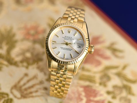 Rolex Oyster Perpetual Datejust 18ct gold ladies automatic wristwatch ref. 69178 with date aperture, luminous gold hands and baton hour markers, silver dial, bevelled bezel and signed 29 jewel calibre 2135 movement, on 18ct gold bracelet, case diameter 26mm, serial number L224131, 1989, in original box with hang tag, Guarantee, Service Guarantee, related paperwork and booklets and outer card box.