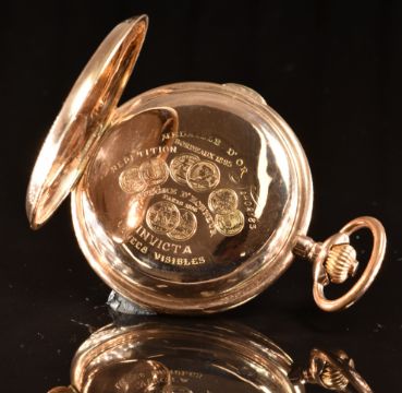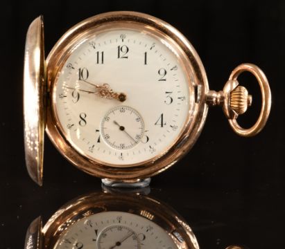 Invicta 14ct gold quarter repeating keyless winding full hunter pocket watch with inset subsidiary seconds dial, ornate gold hands, black Arabic numerals, white enamel dial and Swiss movement, case diameter 59mm, serial number 402133, 125g.