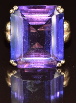 A 9ct gold ring set with an emerald cut synthetic purple sapphire, 10.2g, size H