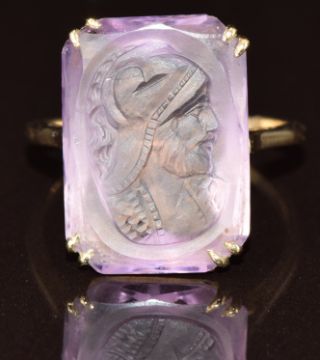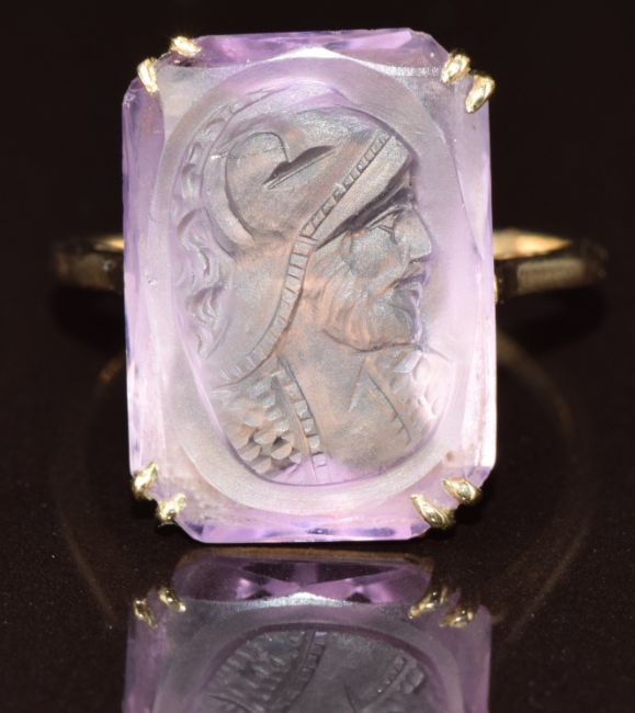 A 9ct gold ring set with an amethyst intaglio depicting a warrior, 4.4g, size P