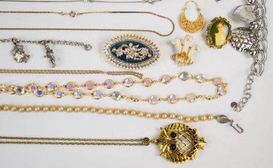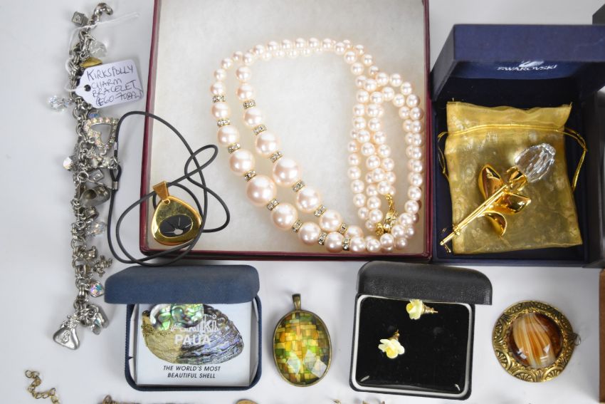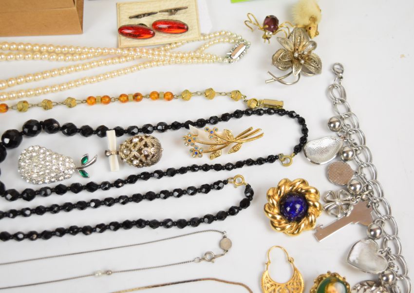 A collection of jewellery including Swarovski brooch, French jet necklace, Kirks Folly charm bracelet, brooches including vintage, Tara, MMA and Movitex, British Museum replica earrings, Jewelcraft spider earrings, Capri pendant, Berebi brooch and pendant, Rotary watch etc