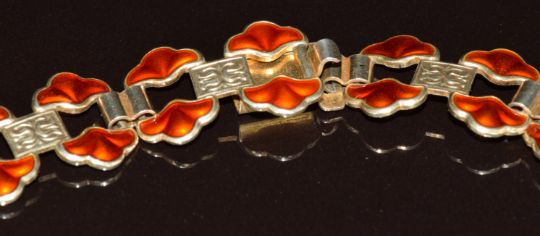 A silver gilt necklace set with red enamel probably Danish, 38g, 40cm