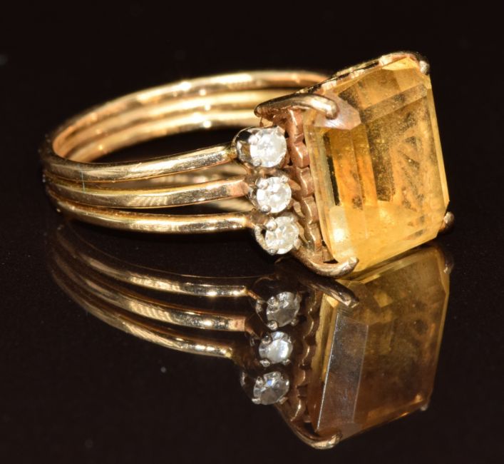 An 18ct gold ring set with an emerald cut citrine and diamonds, 4.6g, size N