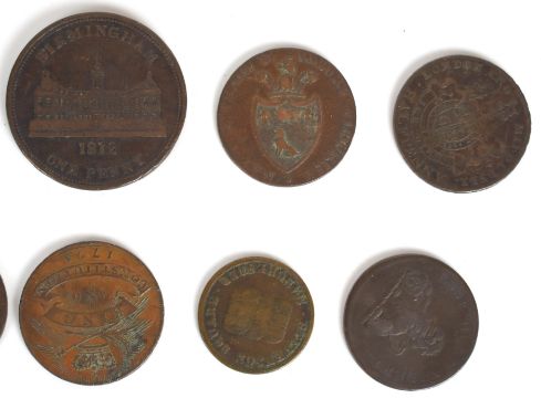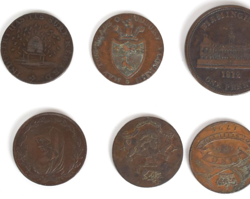 Ten bronze / copper trade and advertising tokens for Hull, two Sudbury, London and Middlesex, Falkner Brothers Drapers Manchester, 1794 King and Constitution, 1795 Industry with beehive, Luddite Preserve the Plough and Sale, 1791 Anglesey Mines and 1812 Birmingham penny Redeemable at Workhouse for 240 tokens