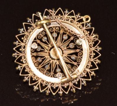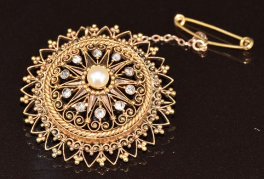 A 14k gold filigree brooch set with rose cut diamonds and a pearl to the centre, 6.8g, 2.7cm