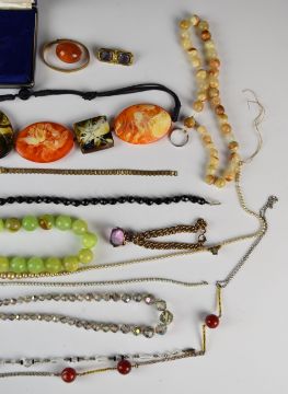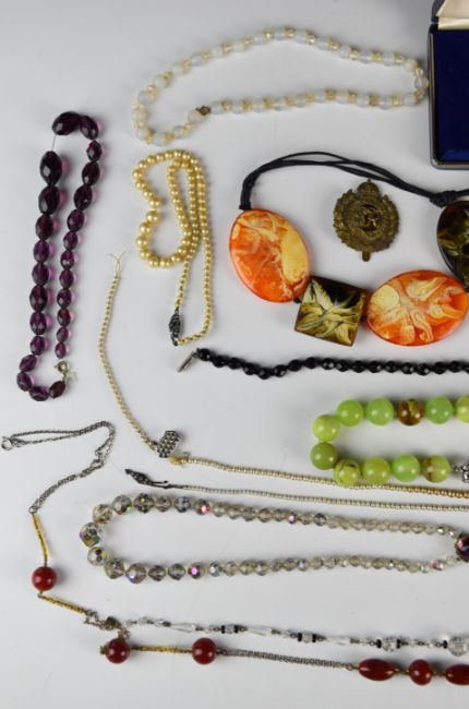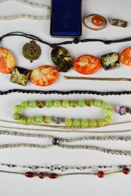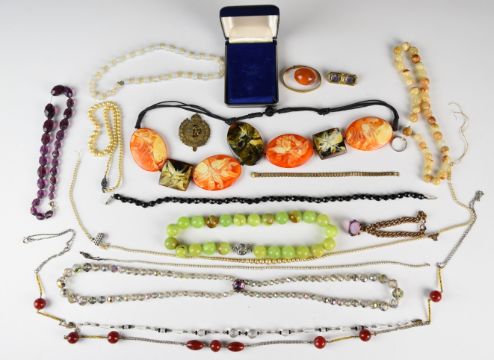 A collection of costume jewellery including agate necklaces, Art Deco beads, silver ring, rolled gold bracelet, etc
