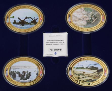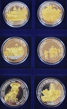 Seven gold plated picture coin sets, most relating to WW2, some in wooden cases and others in presentation packs, also includes a WW1 commemorative set with two replica medals, with certificates