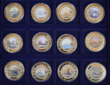 Four gold plated picture coin sets relating to historic ships and British History, all in wooden fitted cases, with certificates