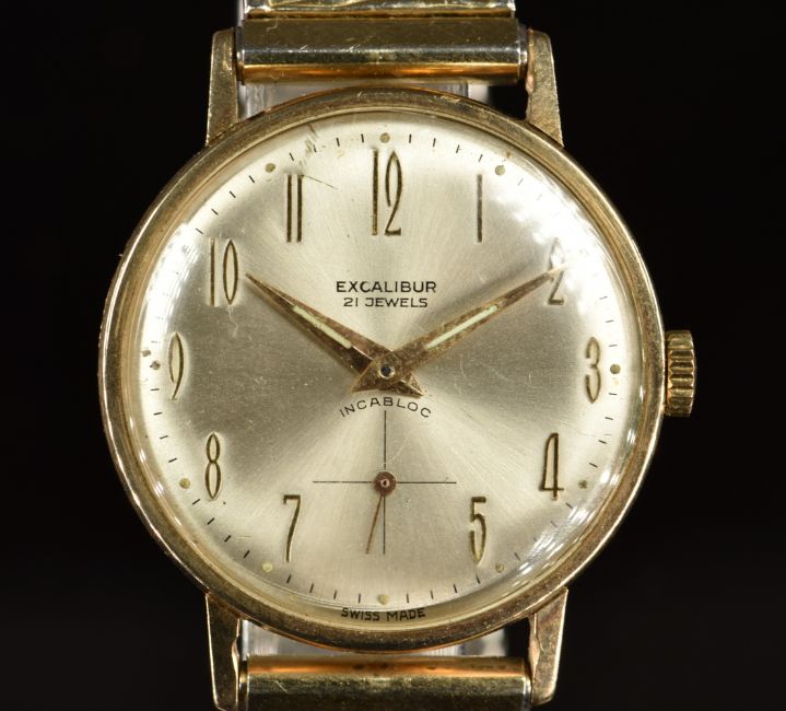 Excalibur 9ct gold gentleman's wristwatch with subsidiary seconds dial, gold hands and Arabic numerals, silver dial and 21 jewel movement, on expanding gold bracelet, case diameter 32mm.