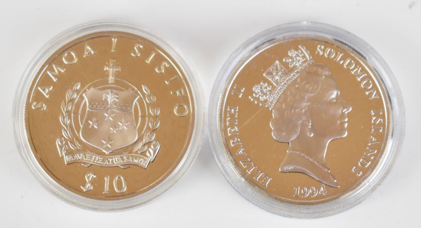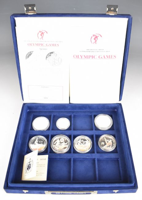 Six 925/1000 silver 31.47g Olympic coins together with a 500/1000 10g silver examples, all but one with certificate