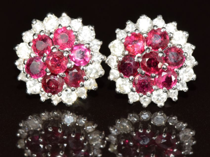 A pair of 18ct white gold earrings each set with a cluster of rubies surrounded by diamonds, 8.5g
