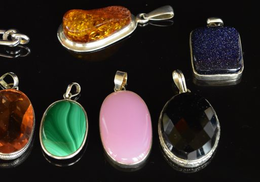Eleven silver pendants including pressed amber, faux sunstone, rose quartz, lapis lazuli, rutile quartz, etc