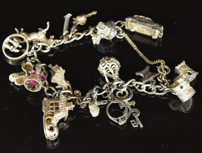 Four silver charm bracelets with over thirty five silver charms including horseshoe, car, hot air balloon, etc 170g