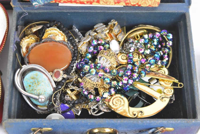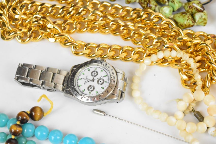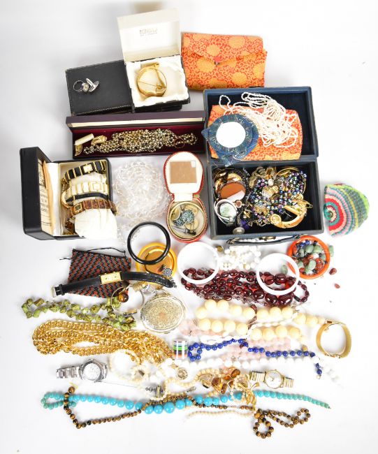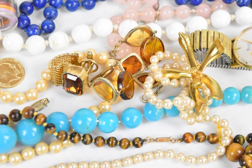 A collection of jewellery including a silver ring set with tiger's eye, rose quartz necklace, tiger's eye beads, fresh water pearl necklace, filigree silver gilt ring set with agate, filigree brooch, silver brooch set with agate, Victorian watch key, etc
