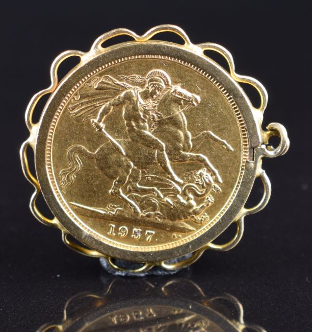 1957 Elizabeth II gold full sovereign in 9ct gold pendant mount, 9.7g