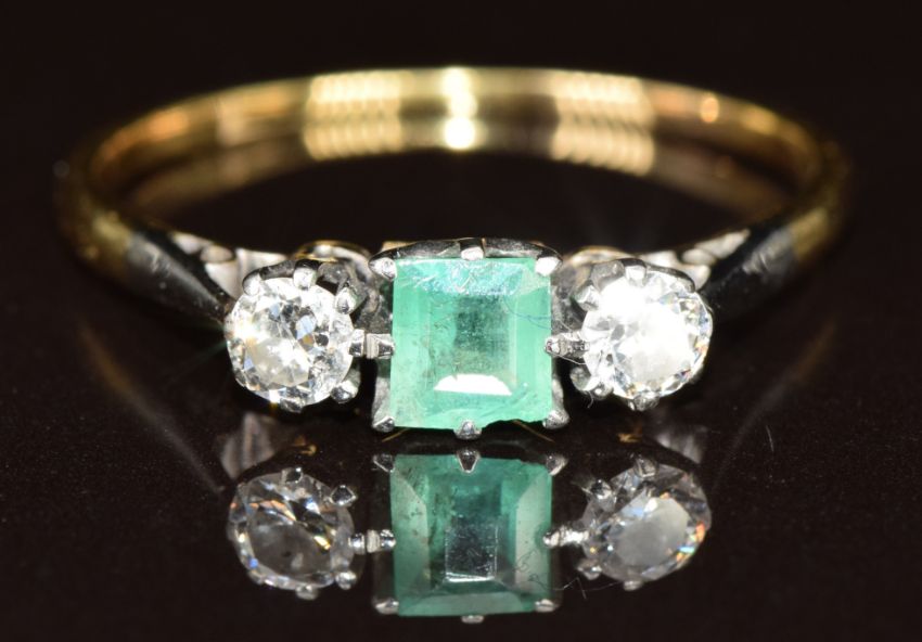 An 18ct gold ring set with an emerald and two round cut diamonds, each approximately 0.15ct, 2g, size U