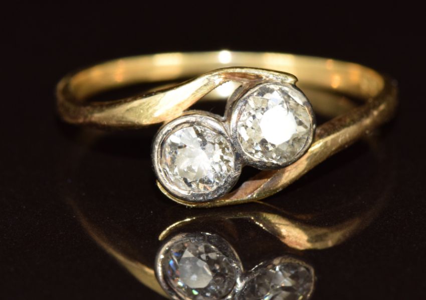 An 18ct gold ring set with two old cut diamonds, each approximately 0.3ct, in a twist setting, 2.1g, size O