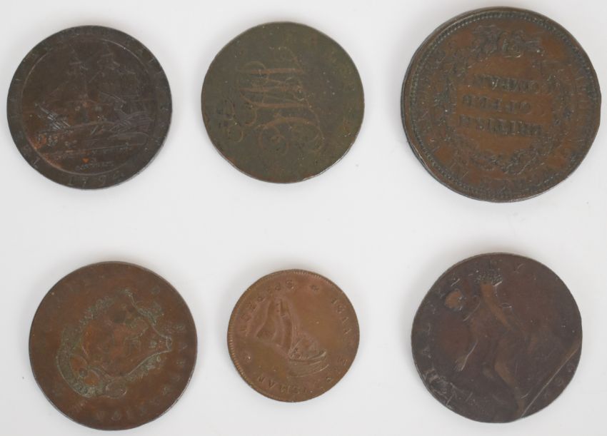 Ten bronze / copper trade and advertising tokens for 1794 Lancaster halfpenny, two 1823 hot air balloon ascended at Oxford and Ironmongers Bishopsgate London verso, Manchester halfpenny, Irish William Fitz Gibbon Cork, Lancaster halfpenny, 1812 Rolling Mill Walthamstow penny, 1797 King and Constitution and 1797 Middlesex and London halfpennies