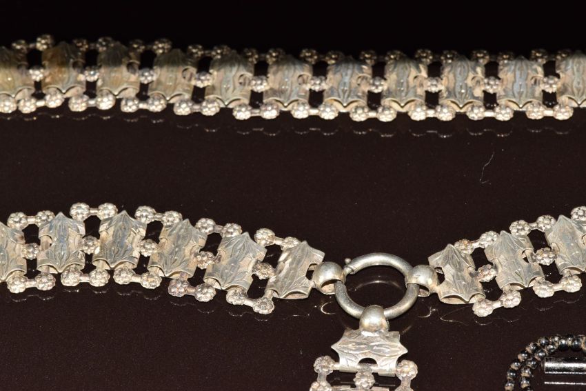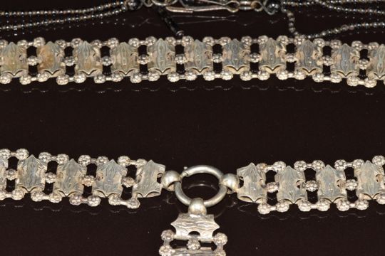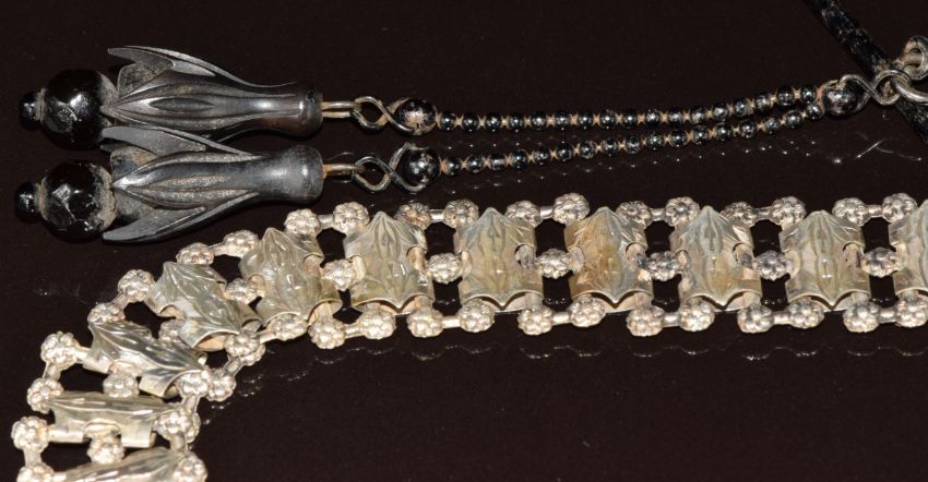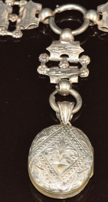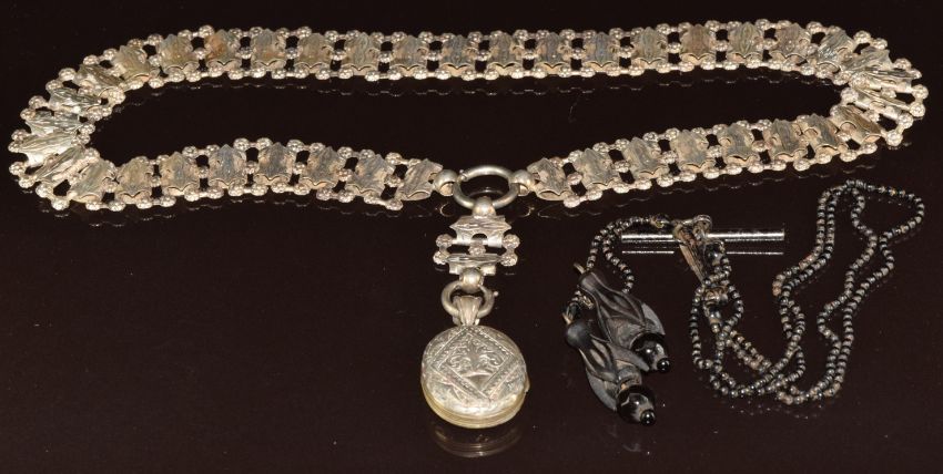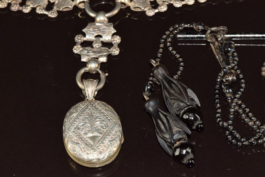 Victorian white metal locket on original chain/ necklace and an Albert with jet tassels