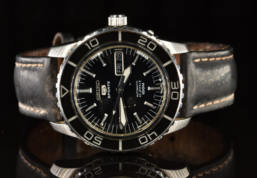 Seiko 5 Sports gentleman's diver's wristwatch ref. 7S36-04N0 with day and date aperture, luminous hands and hour markers, black dial and bezel, stainless steel case, clear exhibition case back and signed 23 jewel calibre 7S36C movement, on black leather strap, case diameter 42mm.