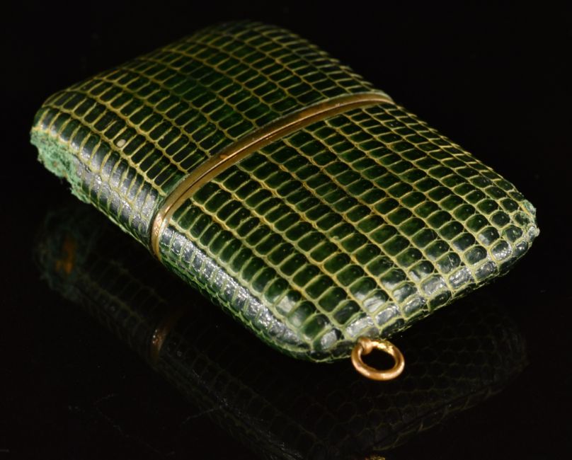 Laco purse watch with white luminous gold hands, gold hour markers, silver dial, green leather case, pop-out stand and 17 jewel movement, 80x36mm when open.