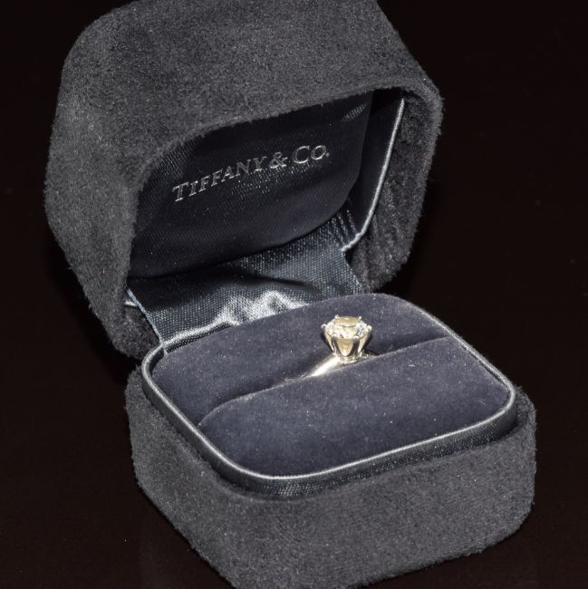 Tiffany & Co platinum ring set with a round brilliant cut diamond of approximately 0.89ct, in original box, 5g, size K