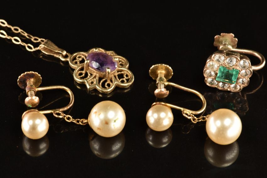 A 9ct gold pendant set with an amethyst, with chain, 9ct gold earrings set with faux pearls and a 9ct gold earring set with an emerald and white sapphires, 6g